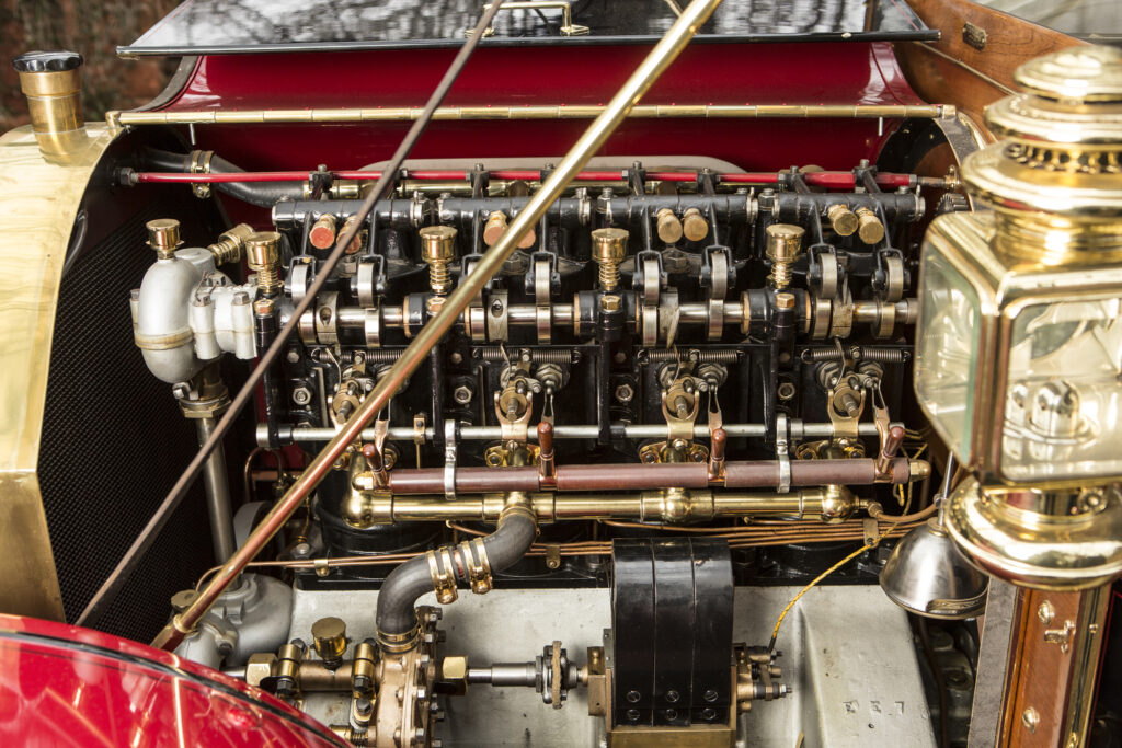 The driveline is equally as non-conformist. Transmission gears are in constant mesh and freewheel until locked onto a hexagonal shaft when engaged. There is no foot operated clutch like in a modern car. To shift you just silently ease the gearshift into one of its three forward gears. Reverse is by a separate lever. Chassis is of Krupp chrome-nickel steel with oak inserts inside the front goosenecks to increase stiffness. The Welch brothers seemed to have had a disdain for ball bearings and Stein reported that only the rear wheels and steering box use them, all others are poured and fitted Babbitt bearings.